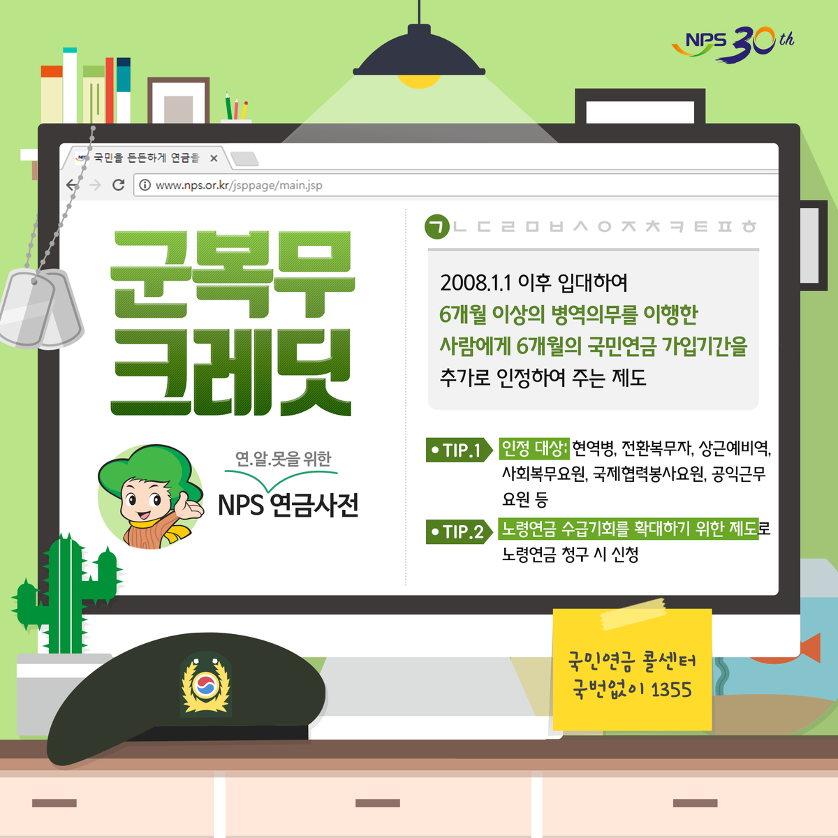 2008.01.01 이후 입대하여 6개월 이상 병역의무를 이행한 사람에게 연금을 받는 시점이 될 때, 국민연금 가입기간을 추가로 +6개월 인정해 주는 제도입니다.
