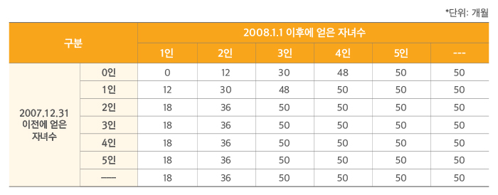 인정되는 기간은 출생한 자녀의 수에 따라 다르며 최소 12개월(2명)부터 최대 50개월(5명 이상)까지 인정됩니다.
