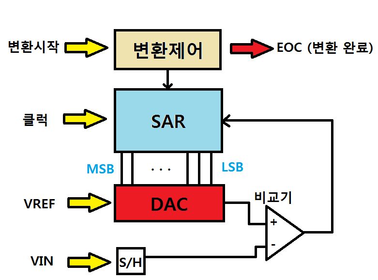 레지스터 또는 아날로그 전압(하드웨어)으로 변환 시작에 대한 신호가 전달되면, 제어회로는 상위 비트(MSB)부터 변환을 시작합니다.