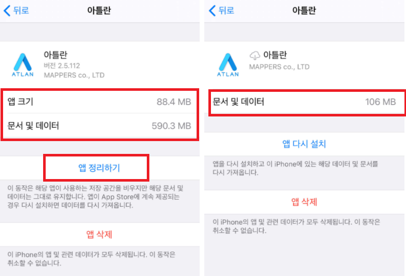 한마디로 앱 정리하기 버튼은 앱이 차지하고 있는 크기(88.4MB)만 지워줍니다. 앱을 정리했을 땐 위 사진 중 오른쪽 화면처럼 문서 및 데이터 용량은 그대로 남게 됩니다.