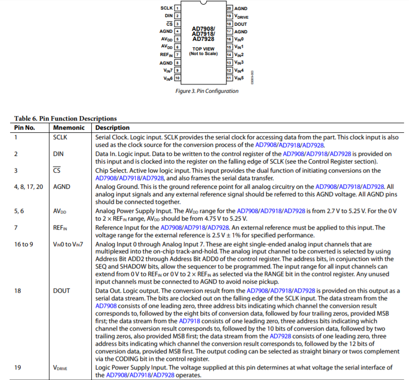 DOUT : Data Output으로 AD7928에서 Digtal로 변환된 data를 해당 핀으로 출력해준다. SPI에서 MOSI로 생각하면 된다.