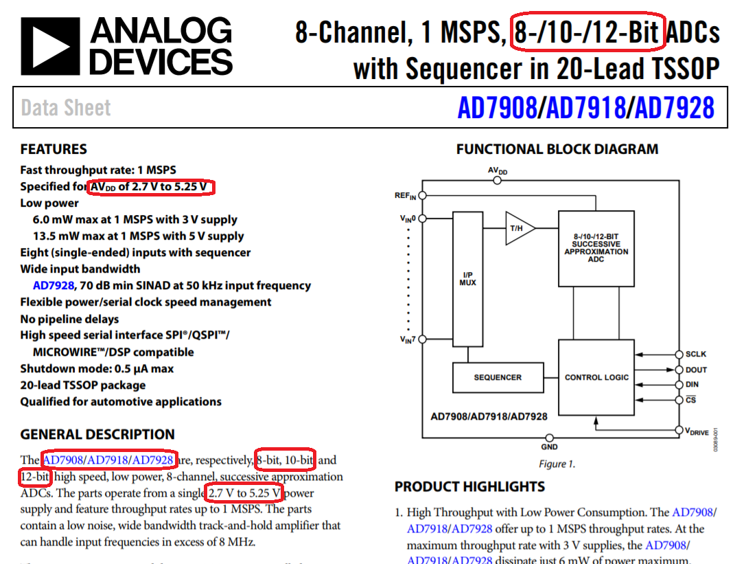 데이터 시트 첫 장을 확인해보면 AD7908은 8 bit의 레졸루션, AD7918은 10 bit의 레졸루션, AD7928은 12 bit의 레졸루션을 갖는다.