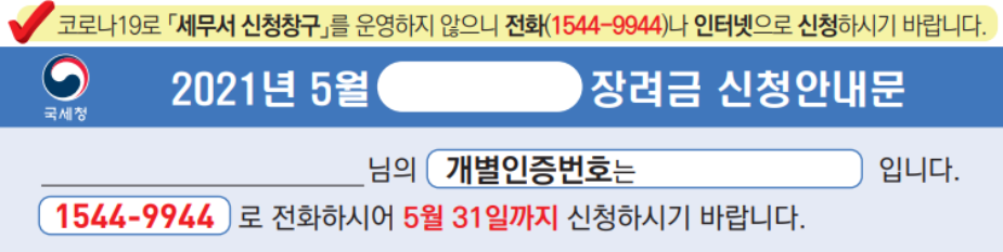 2021년 5월 한 달 동안에 주소지 관한 세무서에 신청하면 심사를 거쳐 지급이 되었으나 코로나 19로 세무서 신청창구를 운영하지 않으니 전화(1544-9944) 또는 인터넷으로 신청하시기 바랍니다.
