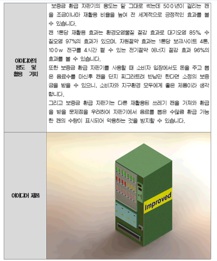아이디어 내용 : 캔 자판기 옆에 캔을 넣으면 보증금을 환급해주는 자판기가 있어 캔을 재활용하면 보증금이 환급되어 친환경적으로 일석이조의 효과를 얻을 수 있다.