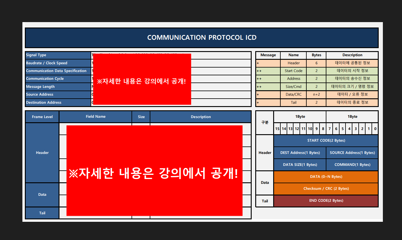 강의를 수강후 최종적으로는 소프트웨어나 펌웨어를 통해 CODING을 할 수 있도록 혼자서도 ICD(통신프로토콜)을 작성할 수 있고 타 업체와 협업을 할 수 있는 능력을 기르게 됩니다.