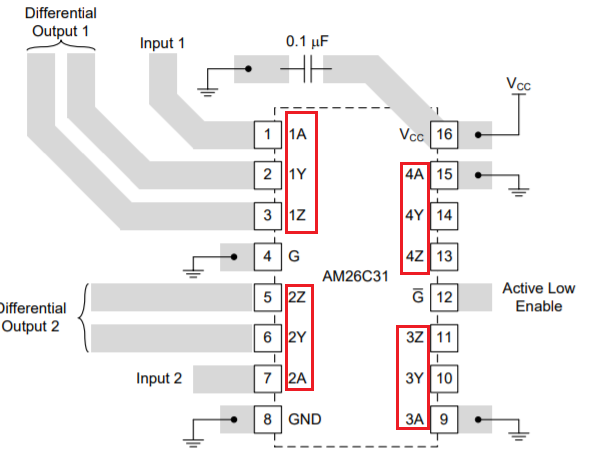 Y & Z : DRIVER Differential output 핀으로 입력에 대한 signal이 차동으로 +- 출력되는 핀이다.