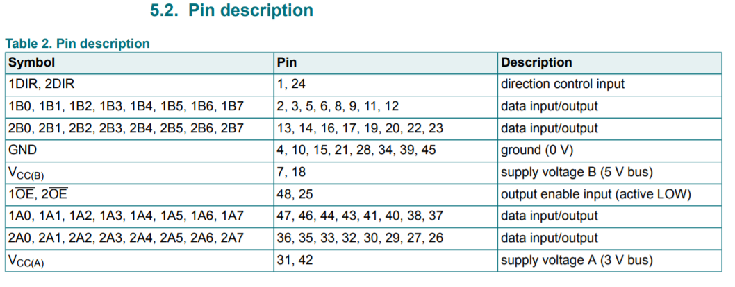 VCC(B)가 5V레벨이므로 1B와 2B는 5V의 신호로 입출력이 되고, VCC(A)가 3V이므로 1A와 1B는 3V의 신호로 입출력이 된다는 점 알고 사용해야 한다.