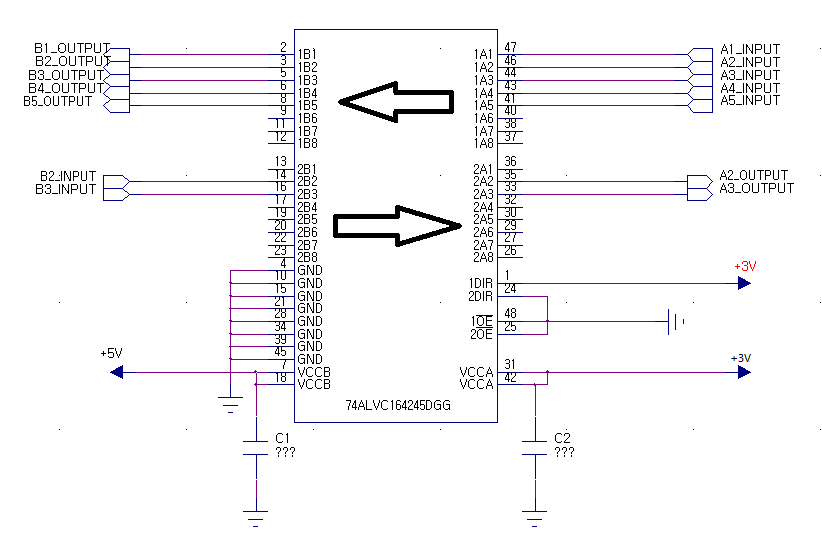 74 ALVC164245를 제어하기 위해서는 DIR 핀과 OE 핀을 이용해 A와 B포트의 방향을 결정해준다.