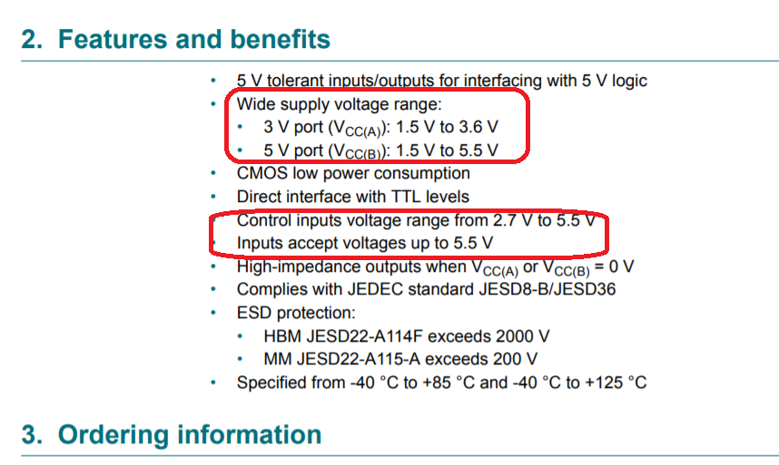데이터 시트 내용을 보면 전압 Range가 VCC(A) port는 3V port로서 1.5 ~ 3.6V까지의 전압을 사용할 수 있다.