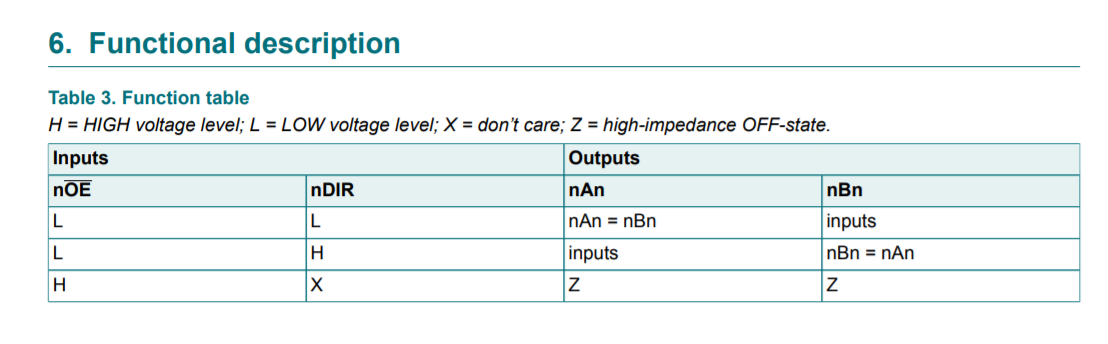 OE핀에 LOW(0)을 입력해주고, DIR 핀에 HIGH(1)을 입력해주면 입력 핀은 nAn, 출력 핀은 nBn이 된다.